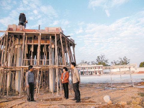 葵潭農(nóng)場黨委書記鐘惠明(中)、場長林慶忠(右)在場部社區(qū)文化廣場建設工地檢查工作。